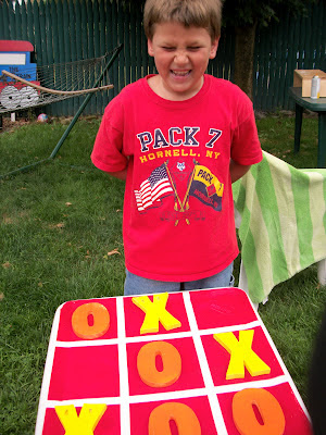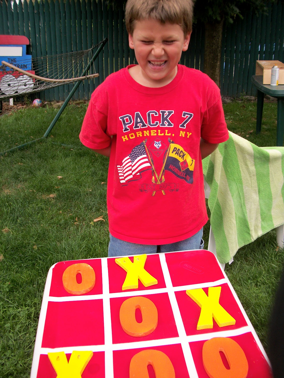 | We’ve had this little table forever; he painted it, cut the tails off the Qs, painted the letters, and woll-ah (voile?) instant tic-tac-toe! |