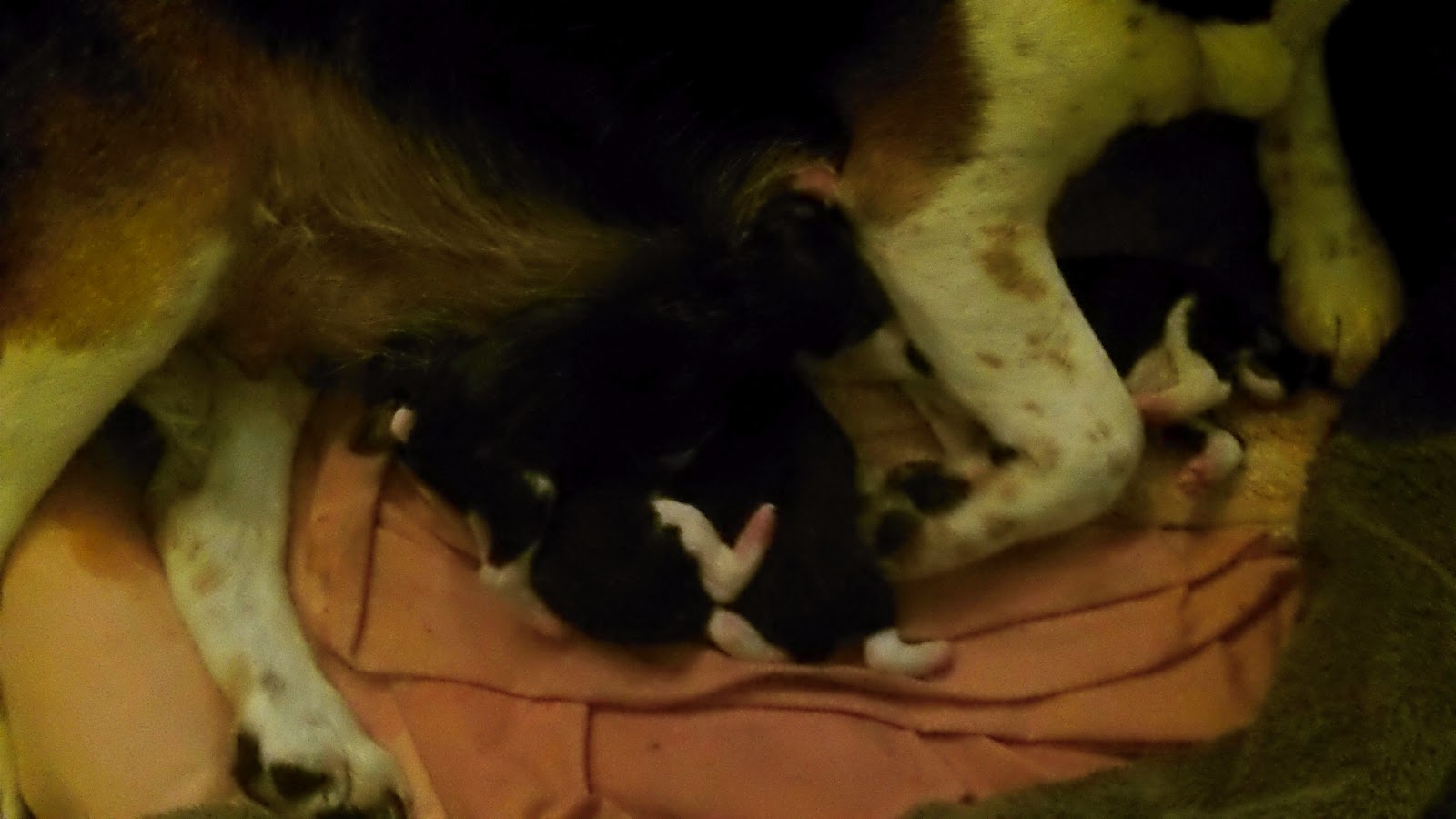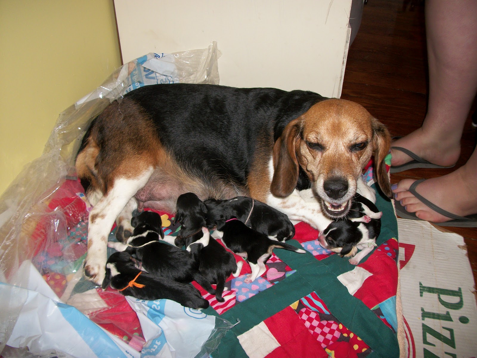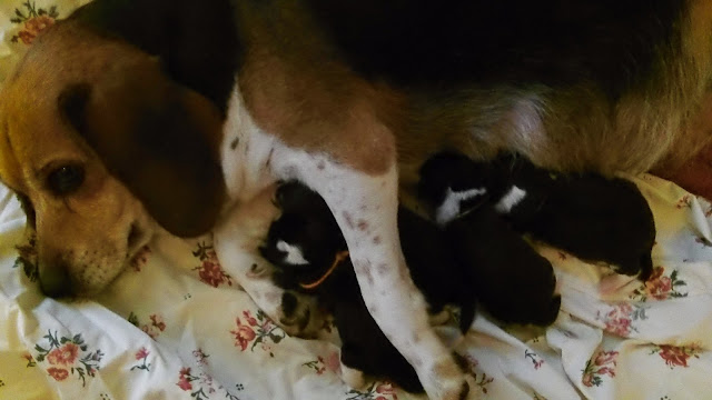 I think I have to explain why we weren’t with a vet in the first place. The simple answer is that we’ve had beagle puppies before. When I was younger one of our female beagles had two litters. Birth is a natural experience, and we don’t find the need for medical prodding and drugs for humans let alone dogs. My mom had my two youngest siblings at home without a midwife; my dad delivered the babies. At any rate, we didn’t plan on their being any difficulties, but guess what? In the end, we were right on target. Within minutes of me getting home Molly delivered another boy, and while we were cleaning him up, a girl was born. My mom walked in just after the third was born. She was crying, and I just looked at her and told her that everything was fine and that Molly had just birthed two puppies within three minutes. Then, Mom went back outside to call everyone she had cried to and tell them that Molly and the puppies were fine. When she was doing that, Molly had another.