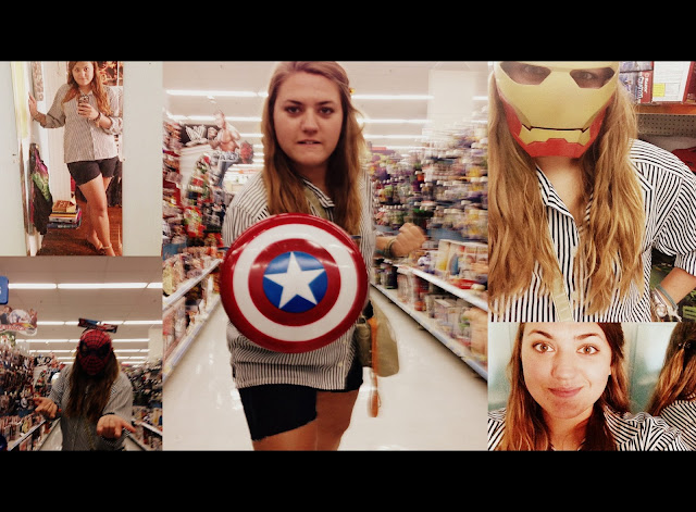 Nothing like walking through WalMart on my day off and casually posing with Avengers/Marvel toys. I love this over sized striped blouse that I got at the Salvation Army. The shorts were also from the Salvo, but I had to fix them up a bit. They weren’t cut evenly.
